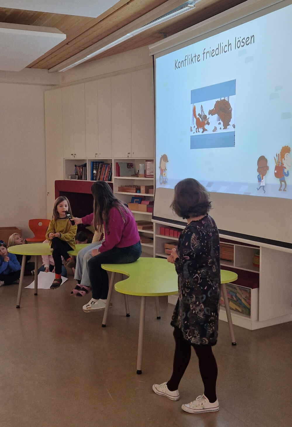 Hurra, wieder einmal Schulversammlung! Die Delfine haben sie am 12. Jänner gestaltet. Konflikte und wie man sie lösen kann, sind diesmal Thema. ALI (Atmen-Lächeln-lnnehalten) soll uns allen in schwierigen Situationen helfen. Zum Abschluss lernen wir alle von den Sonnen noch 5 Begriffe aus der "Unterstützten Kommunikation".