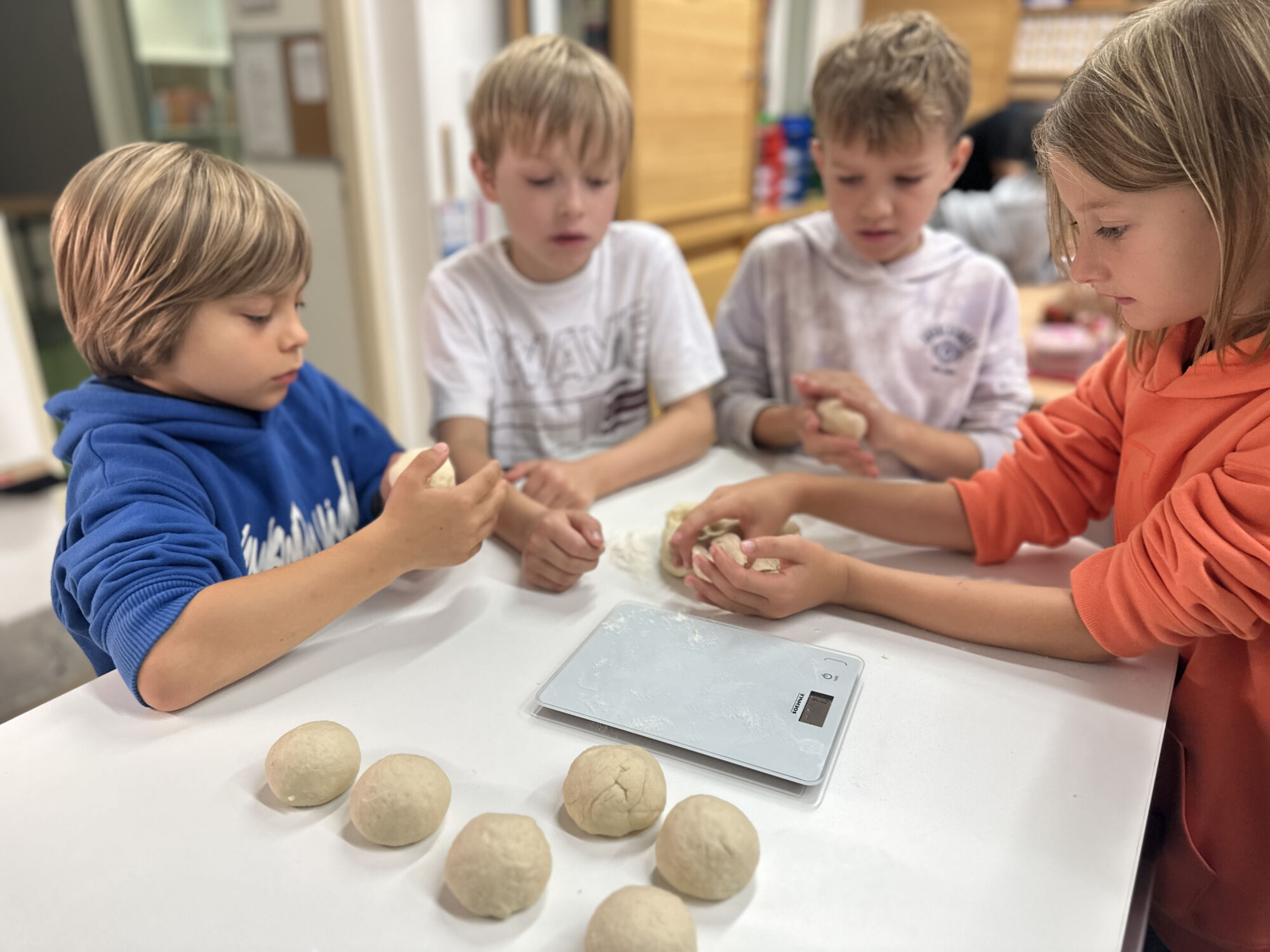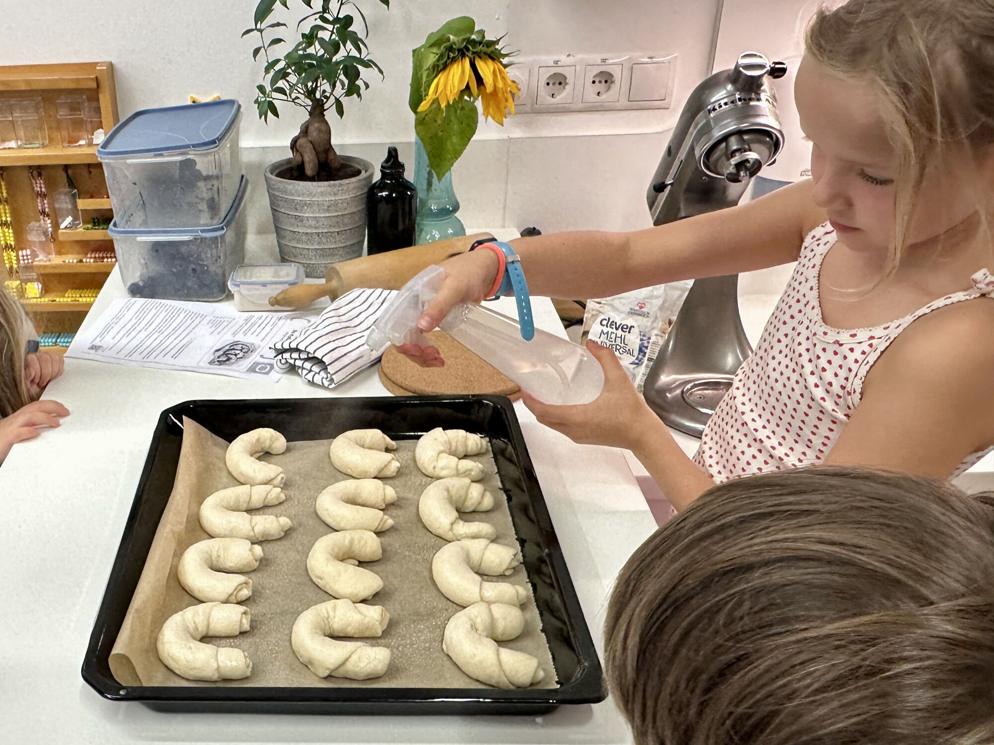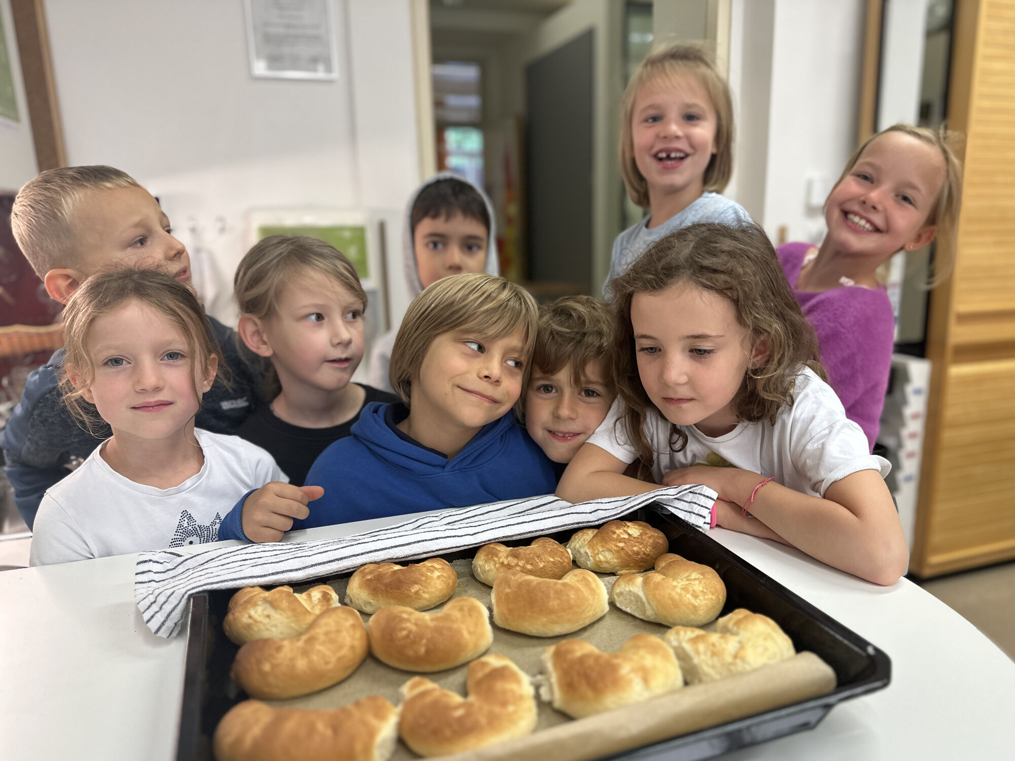 Seit diesem Schuljahr verfügt die Fuchs-Klasse über ein eigenes Backrohr. Die Vorfreude aufs erste Kipferl-Backen war entsprechend groß. Topmotiviert wurde in der 2. Schulwoche gewogen, geschüttet, geknetet, zerbröselt, erwärmt, zugedeckt, gewalkt, geformt, besprüht, sauber gemacht und schließlich gebacken - und vor dem Verkosten gerne miteinander geteilt. Köstlich, wie sich der Duft frischen Gebäcks langsam in der Klasse ausgebreitet hat. Vor dem genüsslichen Verzehr wurde das Selbstgebackene noch ausgiebig beschnuppert! Wir freuen uns auf weitere Backabenteuer!