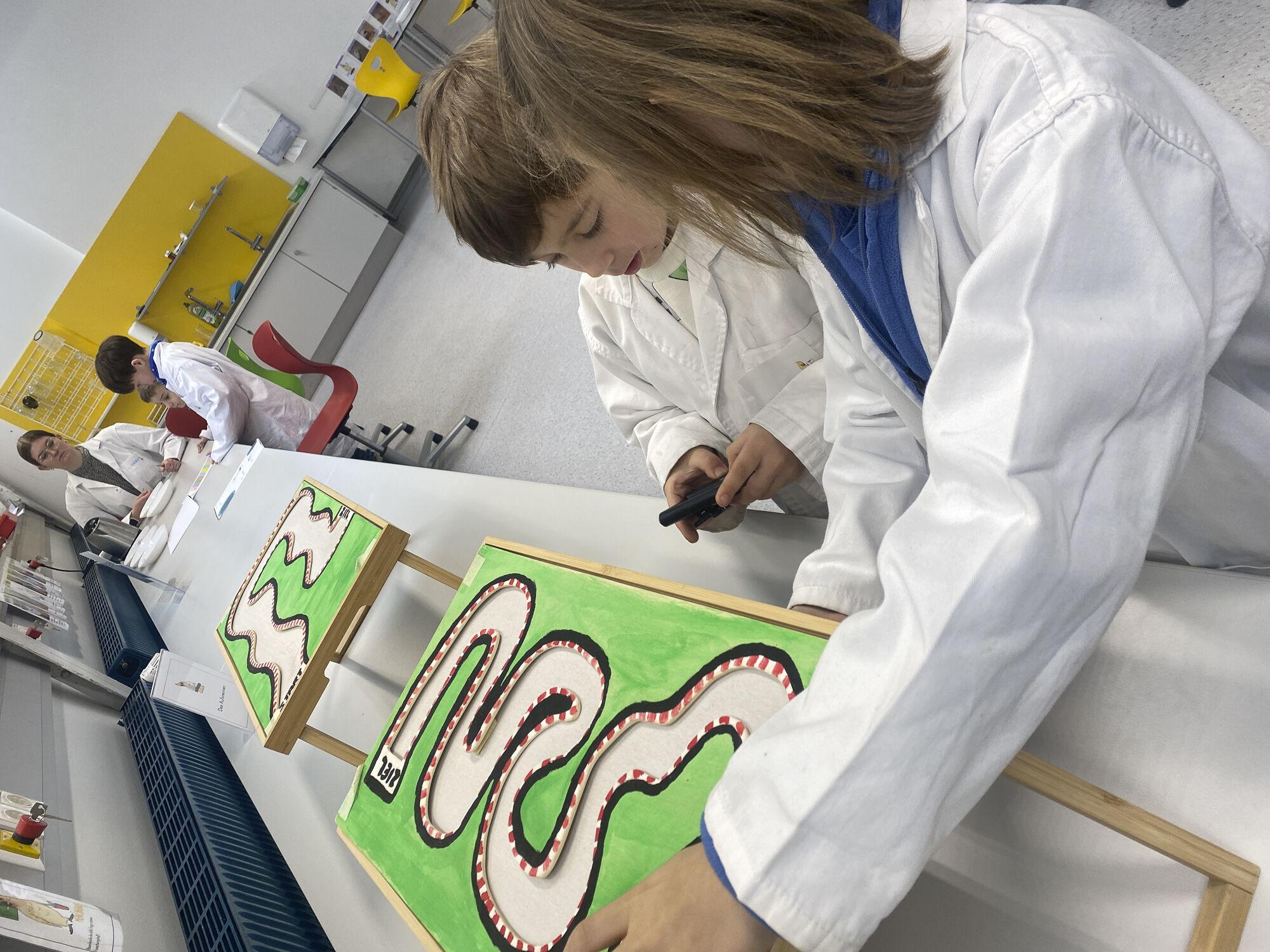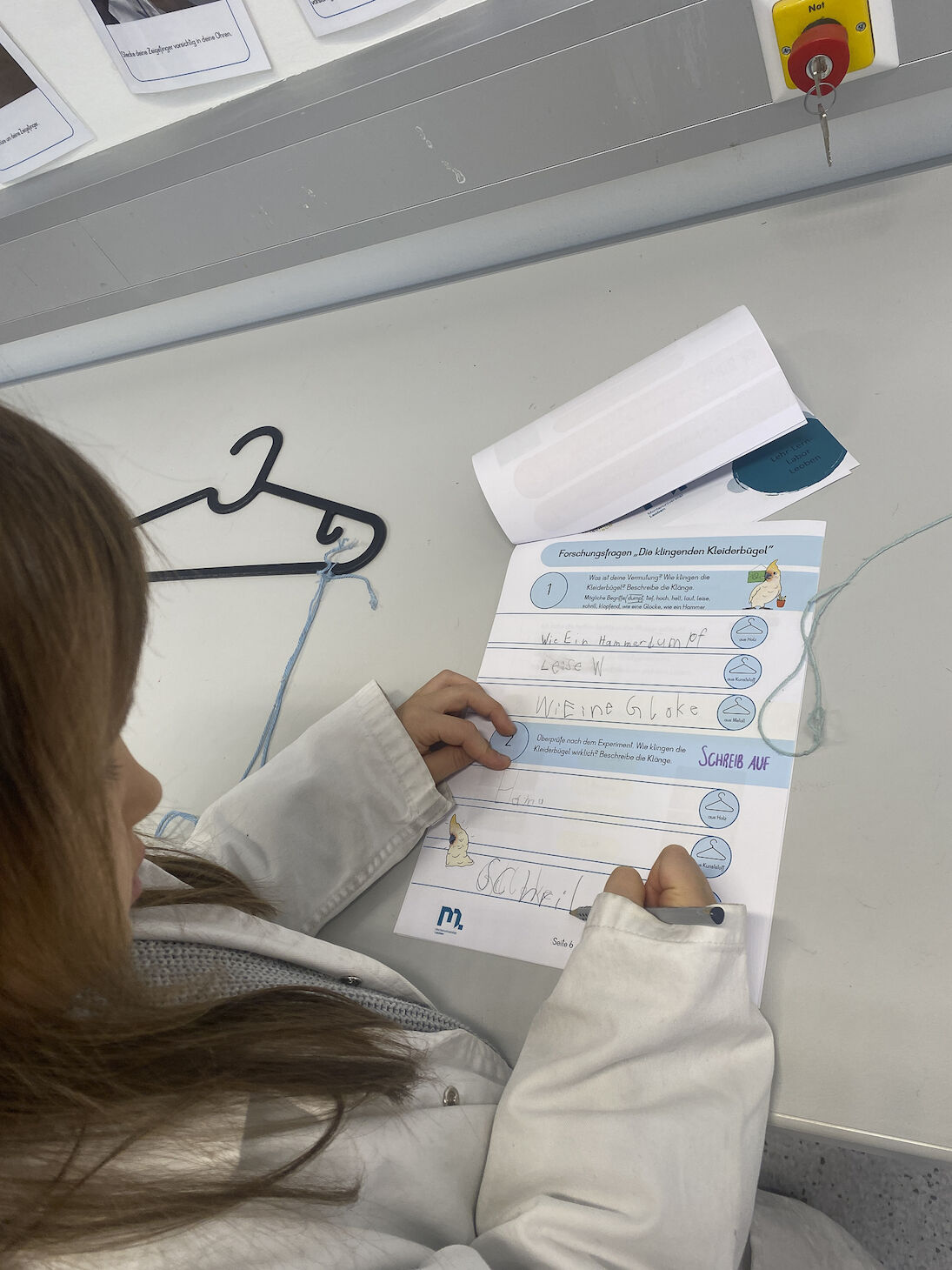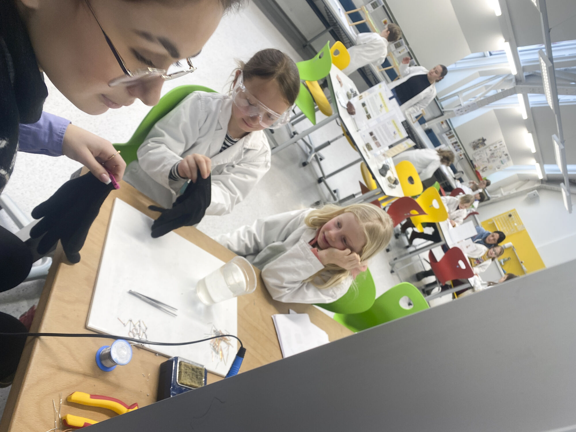 "Wir sind mit dem Zug nach Leoben zur Montanuniversität gefahren. Wir mussten viele Stufen hinaufgehen. Das war sehr anstrengend. In der Garderobe haben wir weiße Mäntel bekommen. Dann haben wir im Labor einen Sitzkreis gemacht. Sie haben uns Materialien gezeigt. Dann konnten wir endlich die Stationen ausprobieren. Als Erstes habe ich ein Experiment mit Büroklammern gemacht. Ein Material konnte sich wieder zurückformen. Danach habe ich die Schraubenzieher ausprobiert. Während wir ein Magnetexperiment gemacht haben, wurden wir interviewt. Als Letztes haben wir das Mikroskop benutzt. Wir haben Zuckerl bekommen. Fast wären wir nicht in den Zug gekommen. Es war toll."