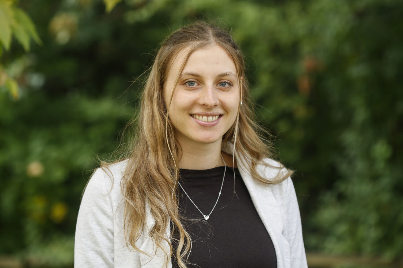 Frau mit schulterlangem Haar in einem grauen Blazer, steht im Freien im Grünen.